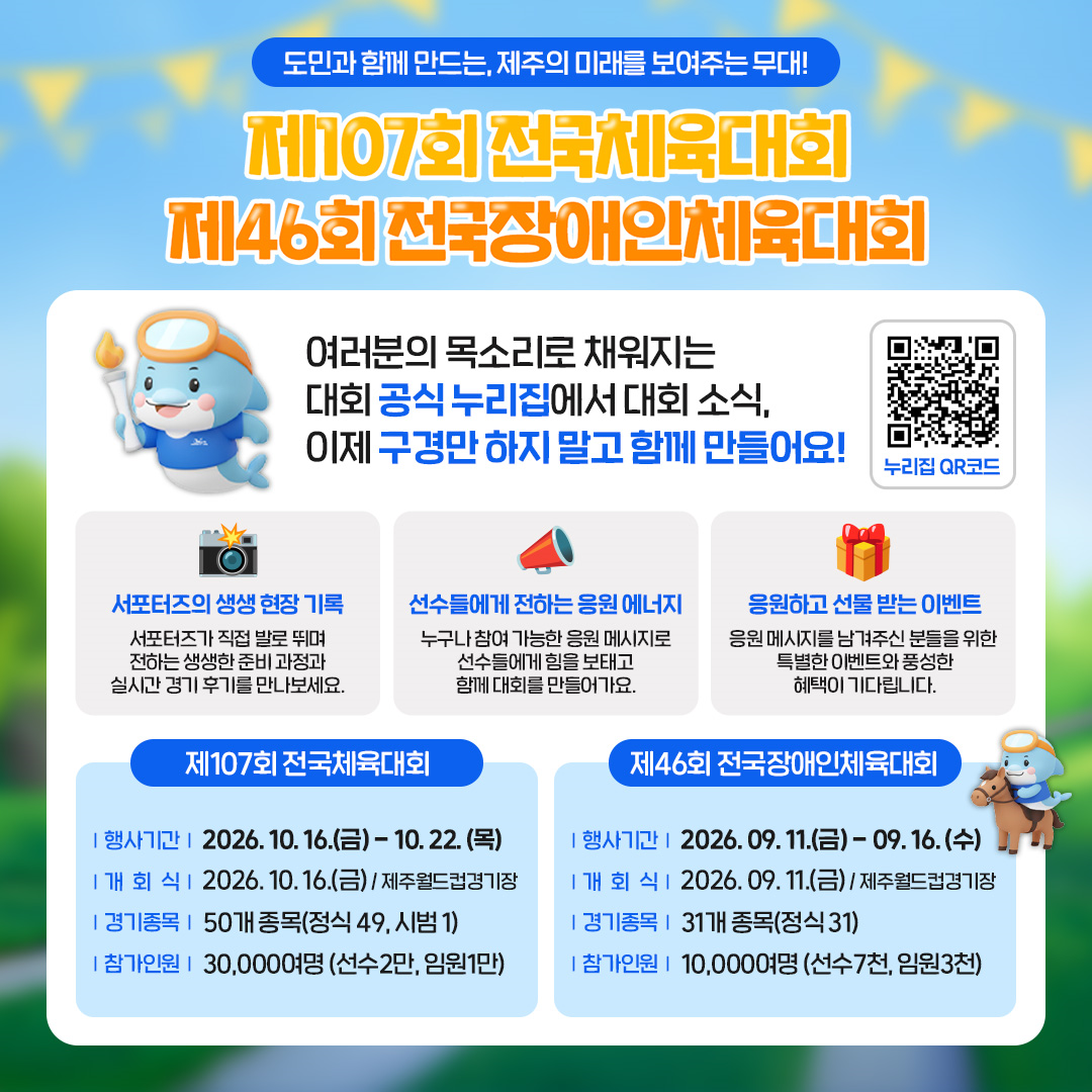 제주특별자치도 제107회 전국체육대회&제46회 전국장애인체육대회 성황리에 개최되길 바랍니다! 다함께 미래로~, 빛나는 제주~ 화이팅!!!♡